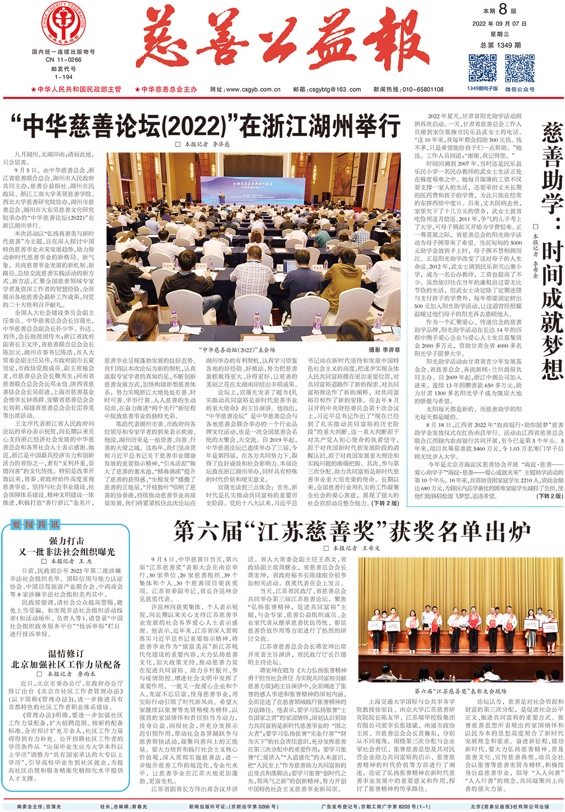 2022年9月5日是中华慈善日,为庆祝第七个中华慈善日,《慈善公益报》参与协办了“中华慈善论坛2022”活动,来自全国各地慈善会、中华慈善总会会员单位、慈善领域专家学者、培训班学员及新闻媒体代表共190余人赴浙江湖州参加论坛,引起行业内外热烈反响。